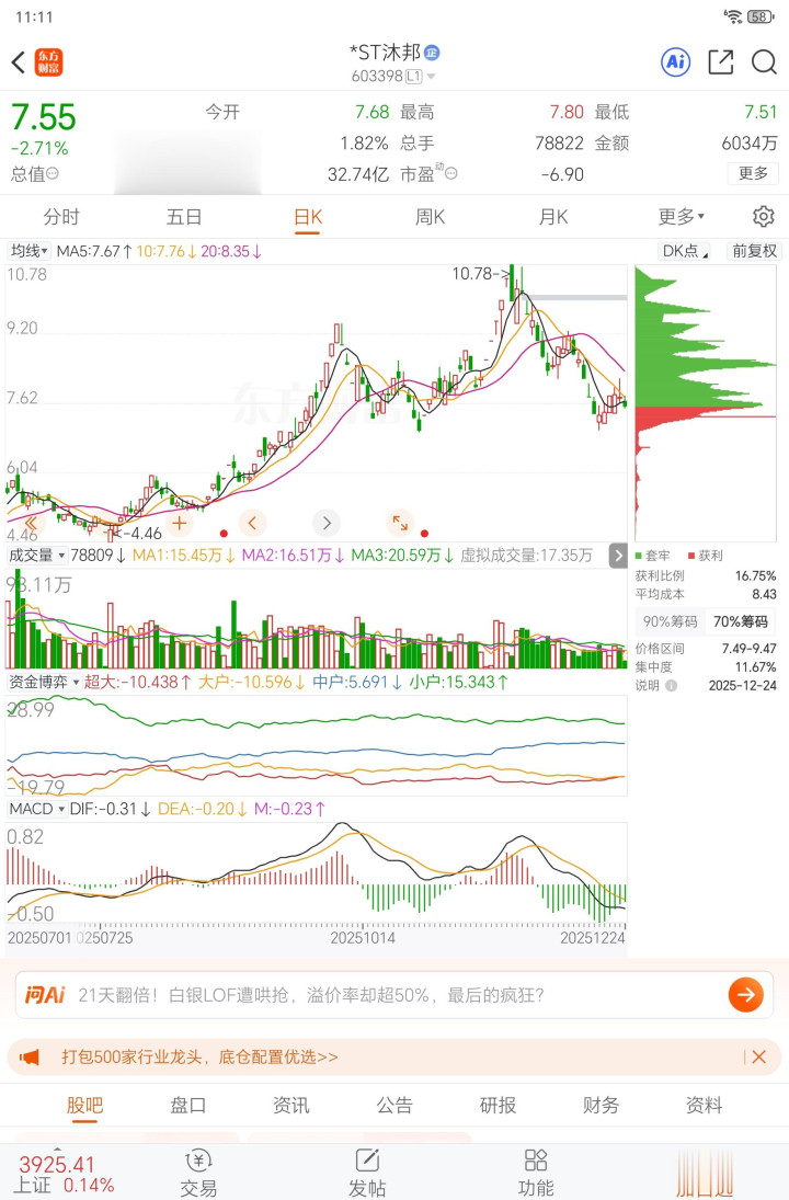 ST沐邦就更不用说了,一路涨得顺风顺水,国庆前最后一天跌停,我还满心欢喜,想着节后能连板大涨,结果十一回来直接一字跌停,不光利润没了,本金都亏进去不少。